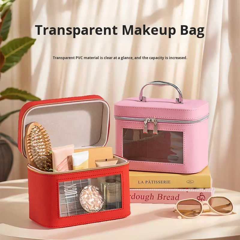 Caja de maquillaje transparente portátil de gran capacidad, nueva ventana, Maleta de PU con cremallera para caja de regalo de recuerdo para el hogar