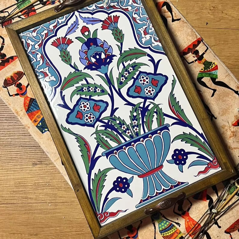 Bandeja grande de madera de cerámica, bandeja de té y café, inauguración de la casa, bandeja de azulejos, bandeja de decoración, cerámica de Arte de estilo otomano, regalo para mujeres, cerámica