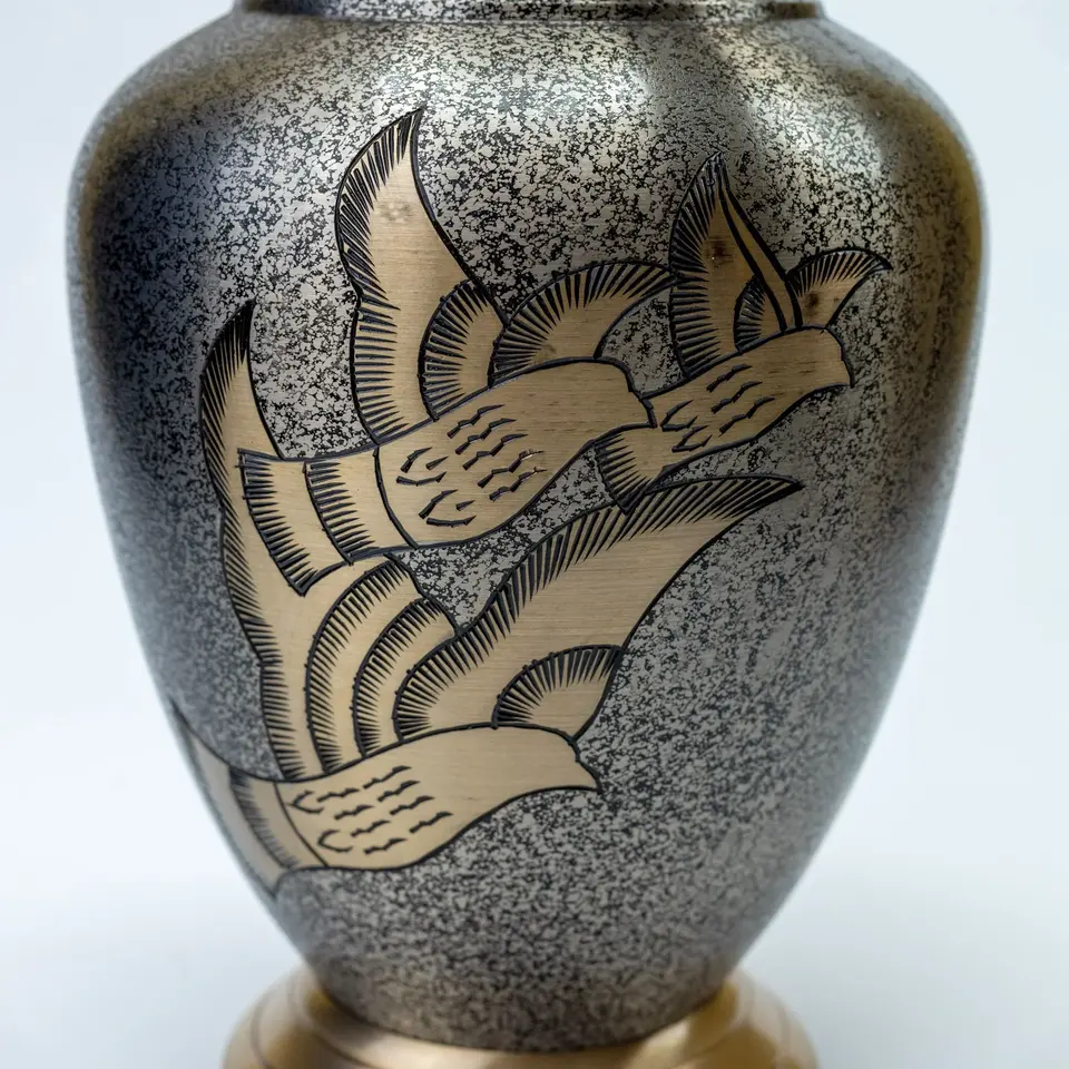 Urna Funeraria Grande de Latón para Adultos con Diseño de Aves Voladoras en Dorado, Plateado y Negro, con Grabado Personalizado Opcional