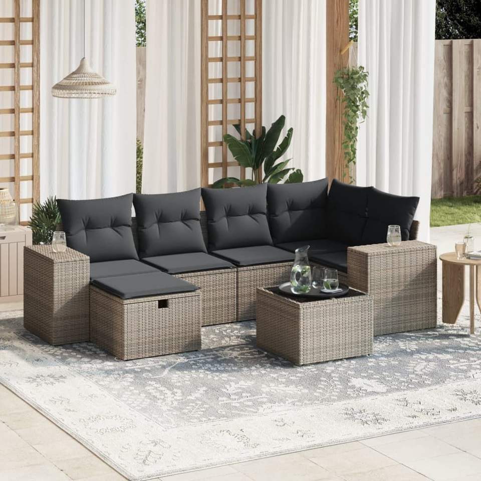 Juego de sofá de jardín de acero de ratán polivinílico gris grande y vidrio templado