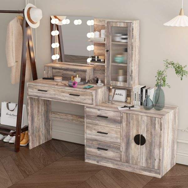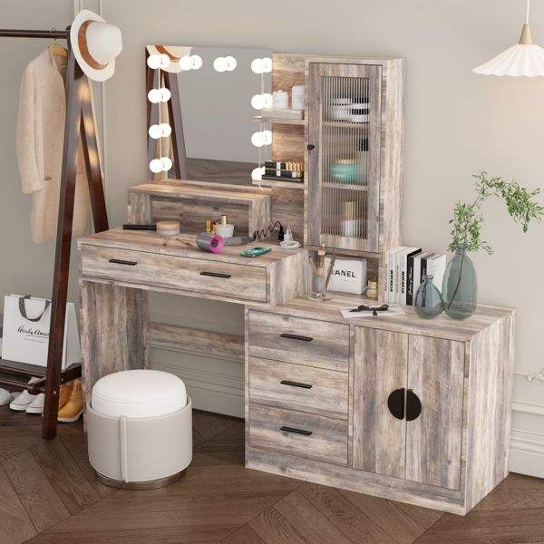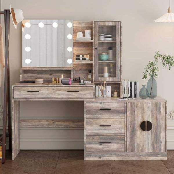 Escritorio de Maquillaje con Luz LED Grande y 10 Bombillas, Mesa de Maquillaje con Estación de Carga, Espejo de Vanidad Elegante
