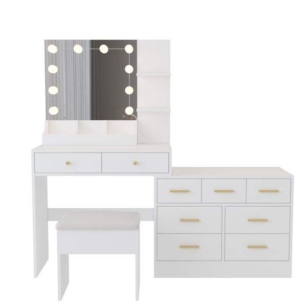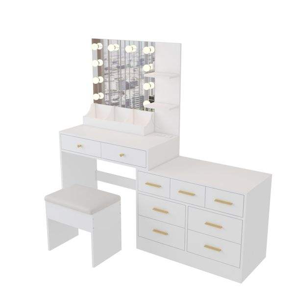 Escritorio de Maquillaje con Luz LED Grande y 10 Bombillas, Mesa de Maquillaje con Estación de Carga, Espejo de Vanidad Elegante