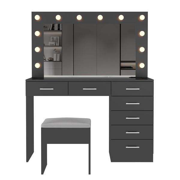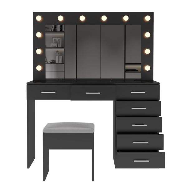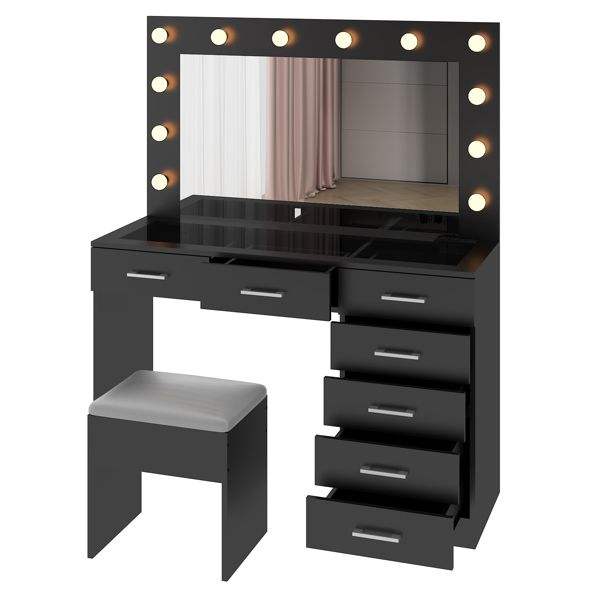 Gran Espejo de Maquillaje Iluminado con 12 LED, Juego de Tocador con 7 Cajones, Mesa de Tocador con Tapa de Cristal y Enchufe de Corriente