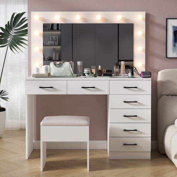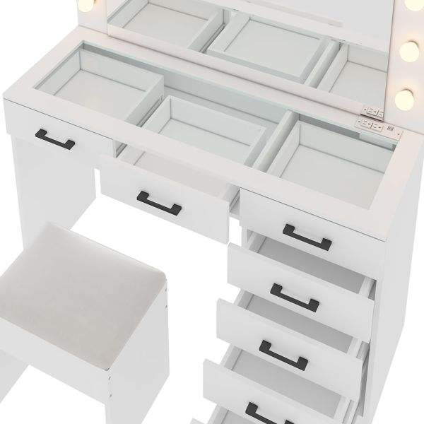 Gran Espejo de Maquillaje Iluminado con 12 LED, Juego de Tocador con 7 Cajones, Mesa de Tocador con Tapa de Cristal y Enchufe de Corriente