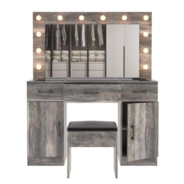 Juego de tocador con espejo iluminado grande, 3 cajones y 2 gabinetes, mesa de tocador con superficie de vidrio