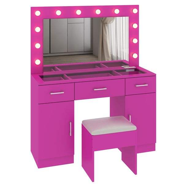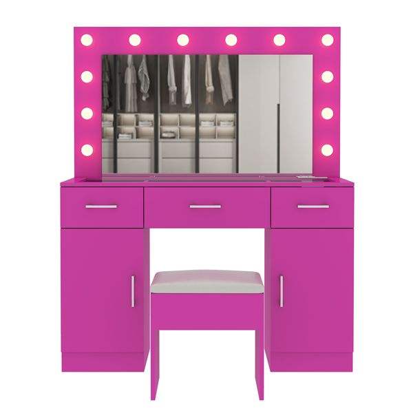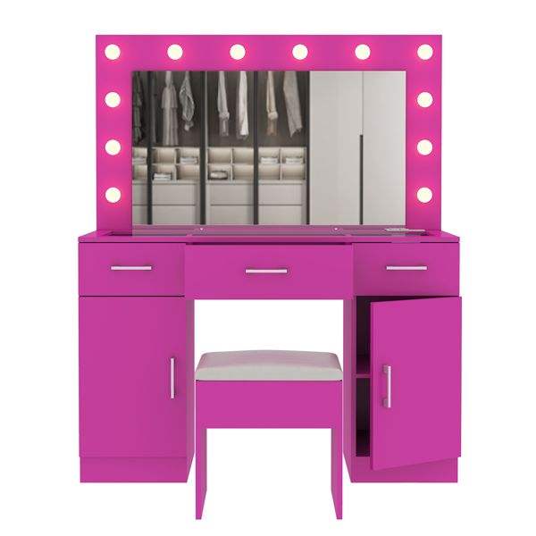 Gran tocador con espejo iluminado, 3 cajones y 2 gabinetes, mesa de tocador con superficie de vidrio