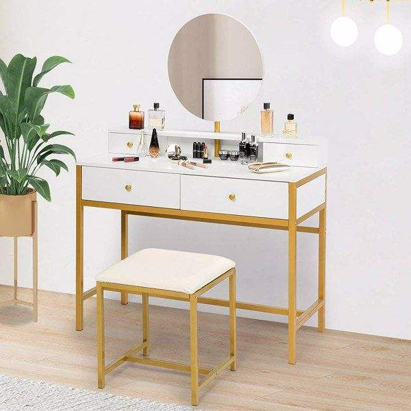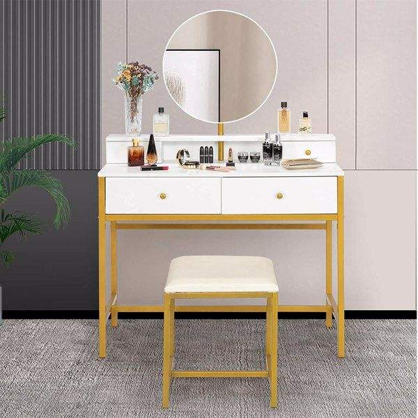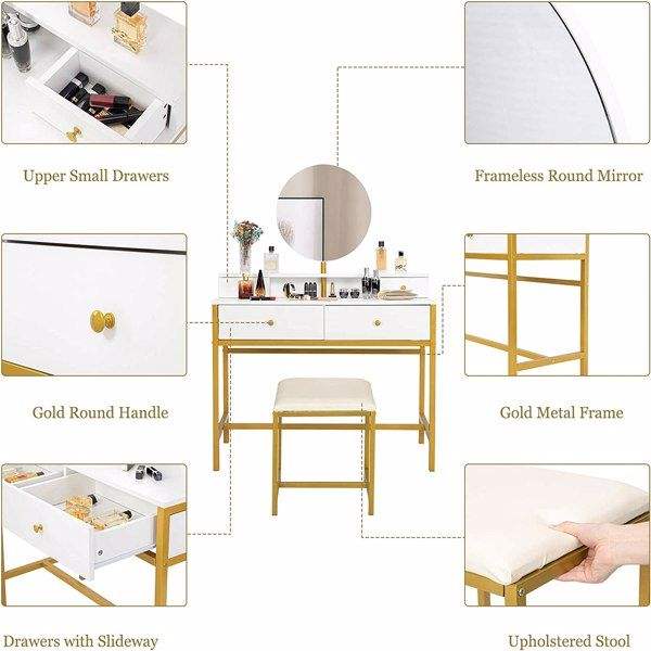 Juego de tocador grande con espejo sin marco, mesa de maquillaje con 2 cajones grandes y 2 cajones pequeños