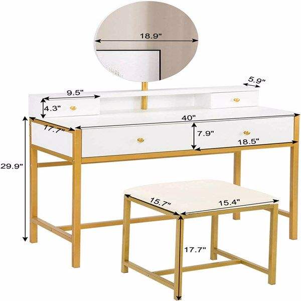 Juego de tocador grande con espejo sin marco, mesa de maquillaje con 2 cajones grandes y 2 cajones pequeños
