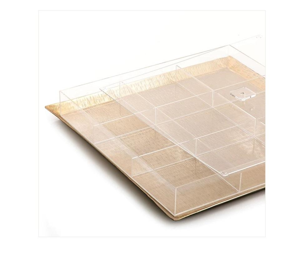 Bandeja grande de comida de color dorado de metal con tapa acrílica Bandeja para servir chocolate de aluminio de forma cuadrada maravillosa Diseño elegante