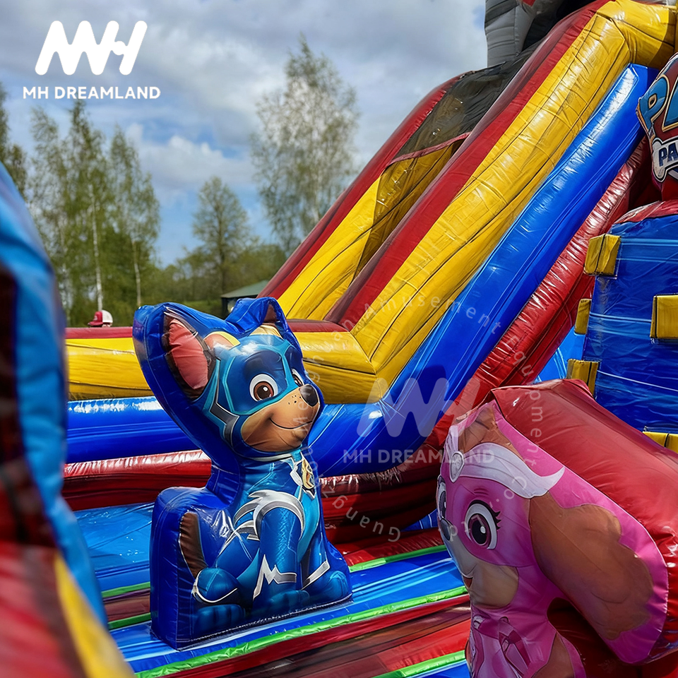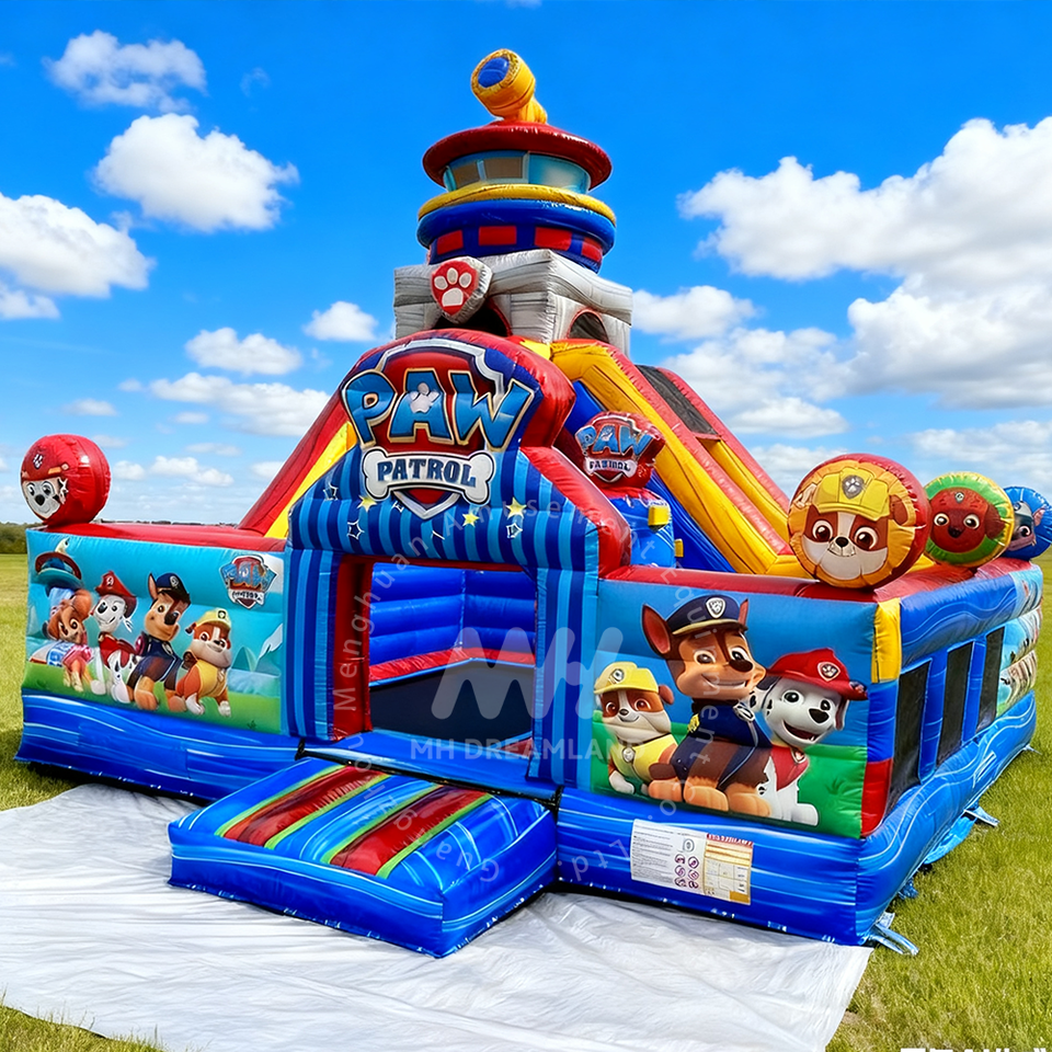Gran castillo inflable exterior con huella de perro, casa de rebote con obstáculos y pared de escalada, diversión para niños y adultos