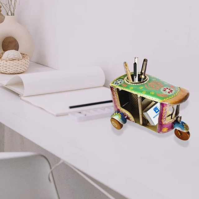 Organizador de Escritorio con Diseño de Rickshaw Indio, Ideal para Almacenar Herramientas de Escritura y Tarjetas de Presentación, Decoración Corporativa