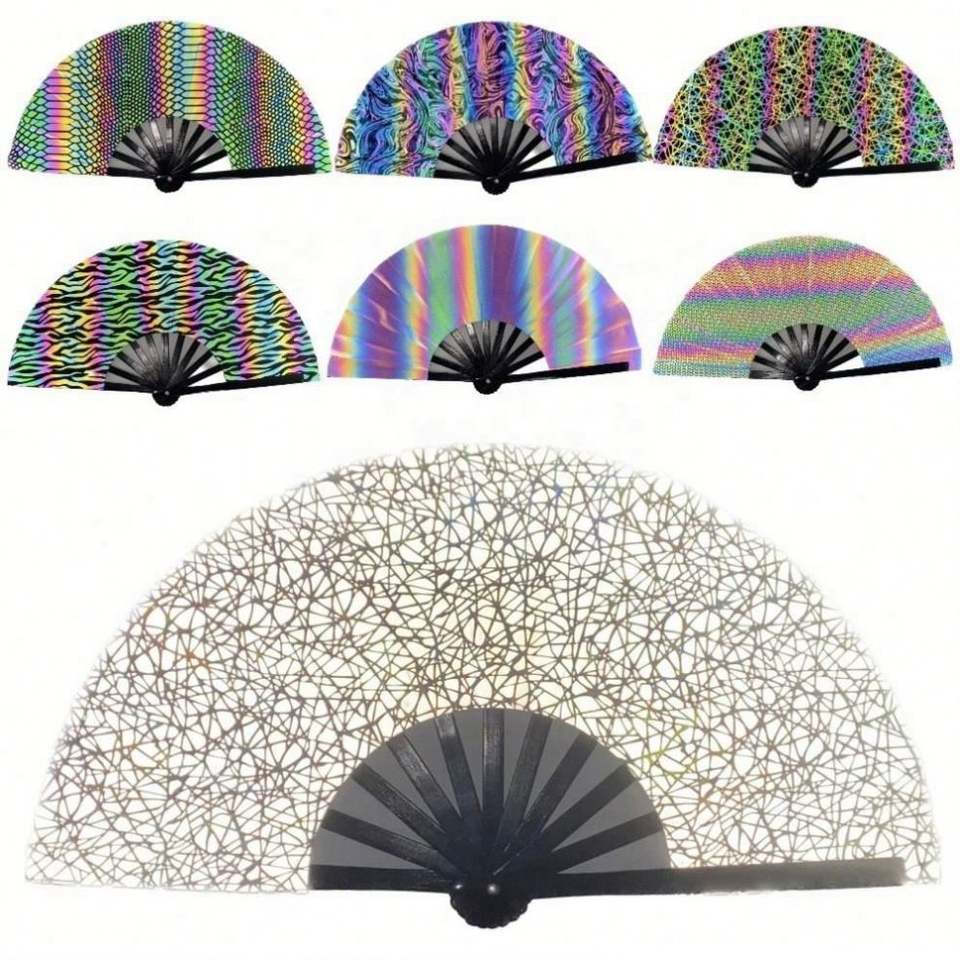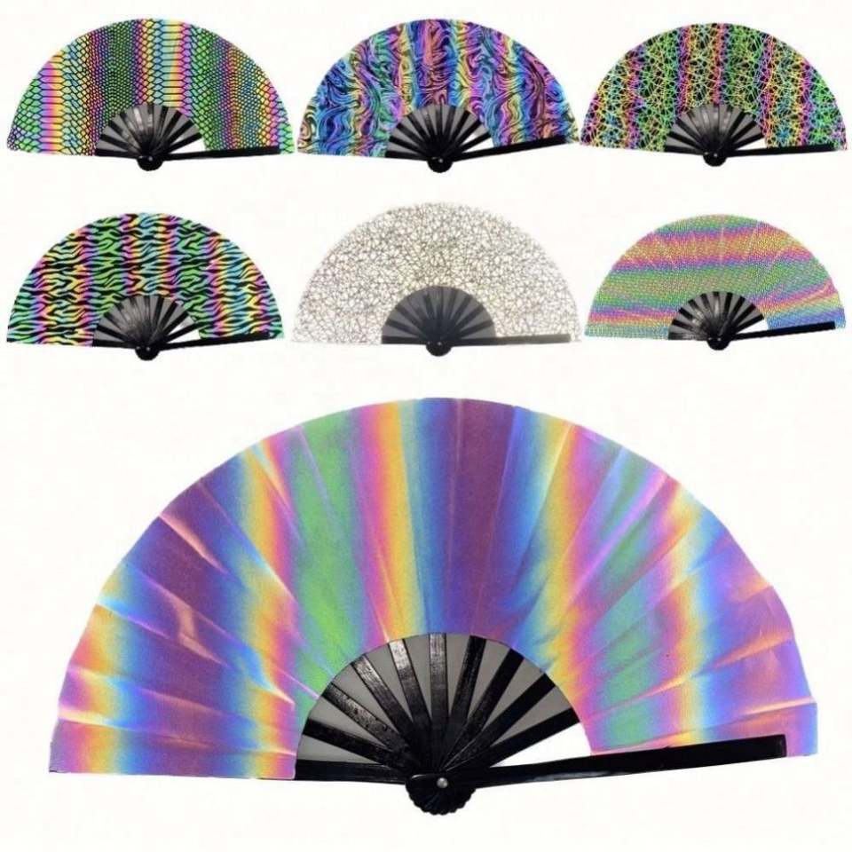 Abanico de Mano Reflectante Grande de 27 cm / 33 cm, Abanico Holográfico UV de Bambú Plegable de Alta Calidad, Abanico para Fiestas