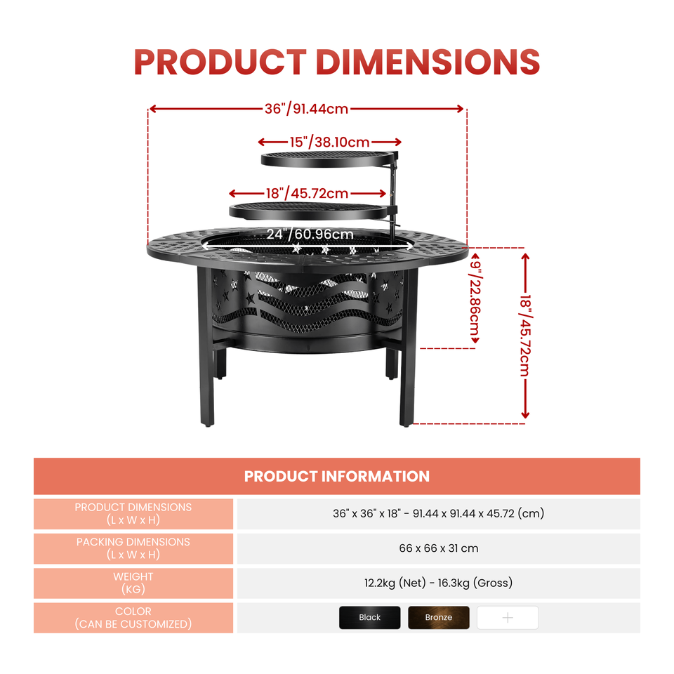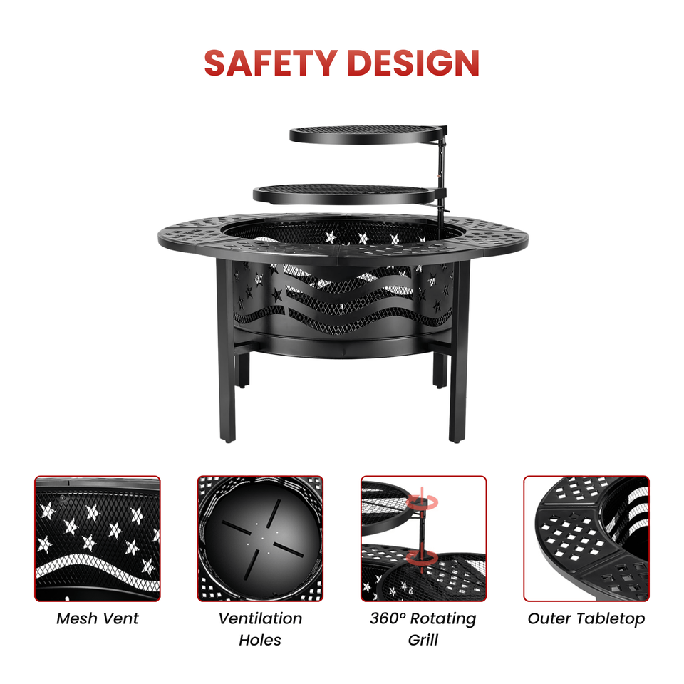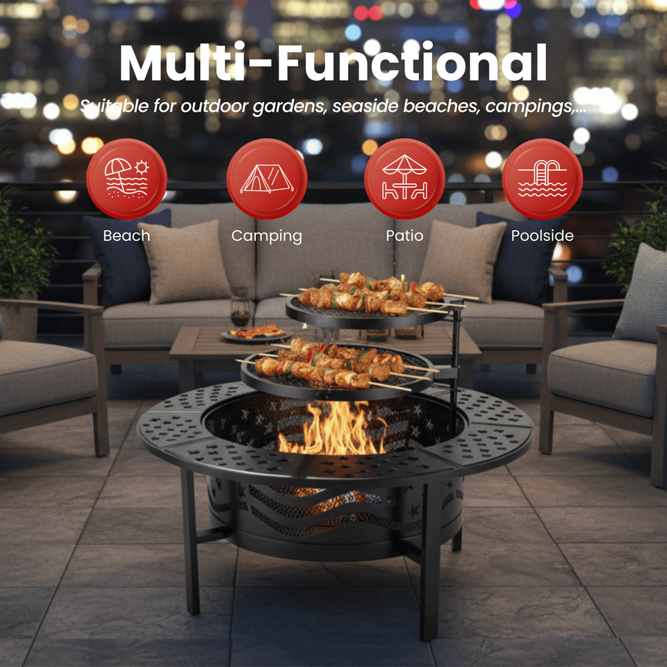 Mesa de Fogata Redonda Grande para Exteriores, Parrilla para Barbacoa, Fogata de Leña Moderna para Exteriores con Rejilla de 2 Niveles FP006