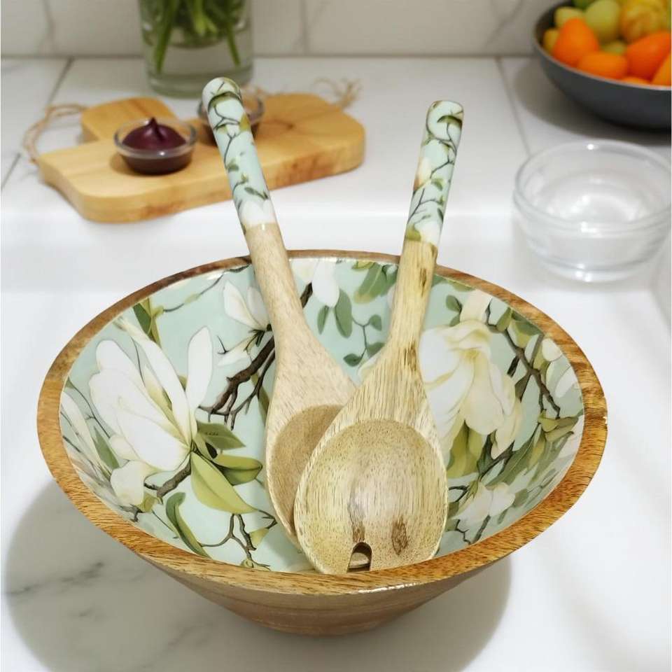 Cuenco grande de madera de mango rústico para servir ensaladas, verduras, pan, aperitivos y estilo moderno de comedor familiar