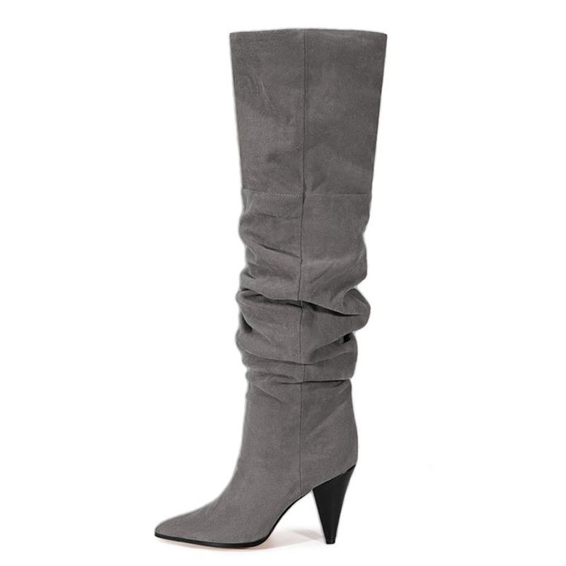 Botas Largas de Tacón Alto y Punta Puntiaguda para Mujer, Talla Grande 45, de Gamuza Plisada, Ajuste Ancho, por Encima de la Rodilla, con Tacones de Aguja
