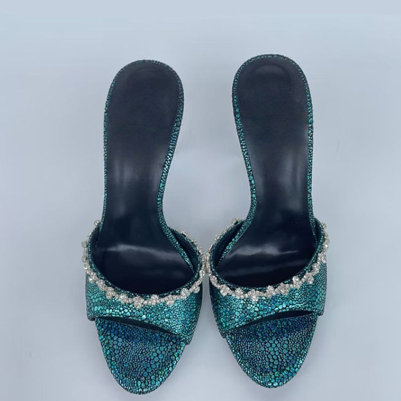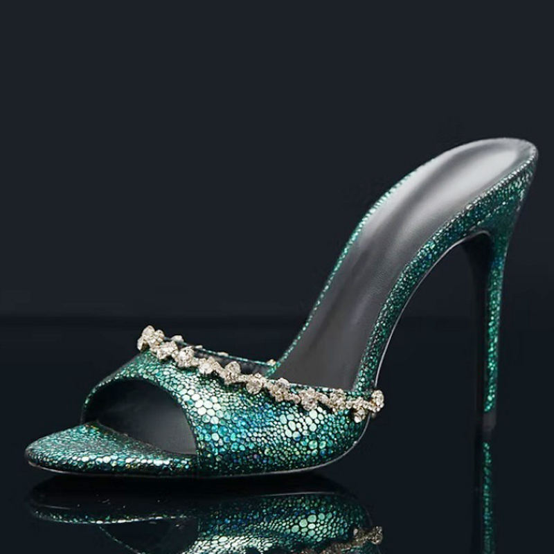 Sandalias Verdes de Diseño Sencillo para Mujer, Talla Grande 45, Zapatos de Tacón Alto Stiletto para Pies Anchos, con Cadena de Diamantes, Tipo Mules