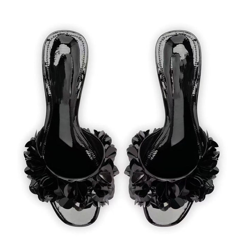 Sandalias de tacón bajo de aguja con punta abierta para mujer, talla grande 46, ajuste ancho, con estampado floral brillante y charol.