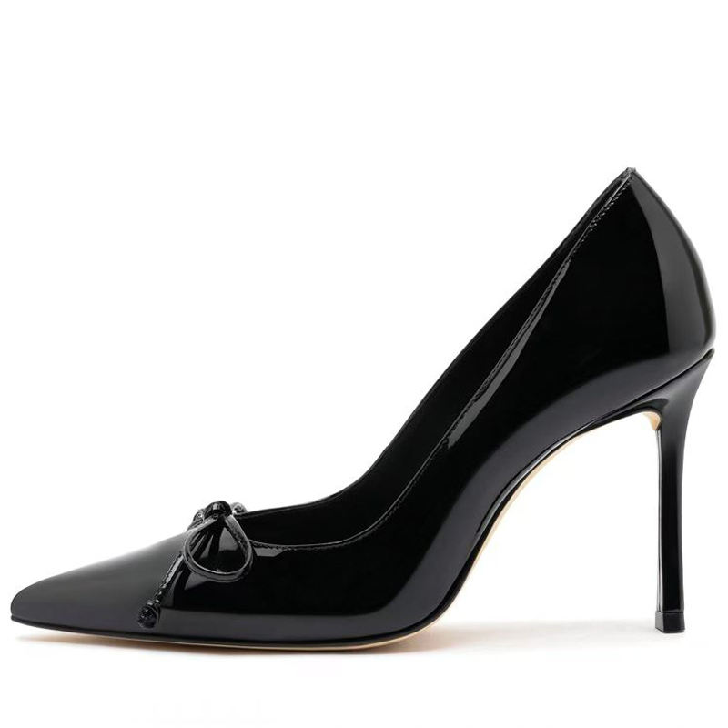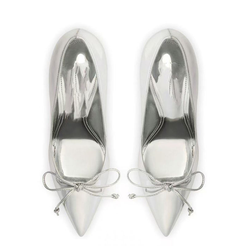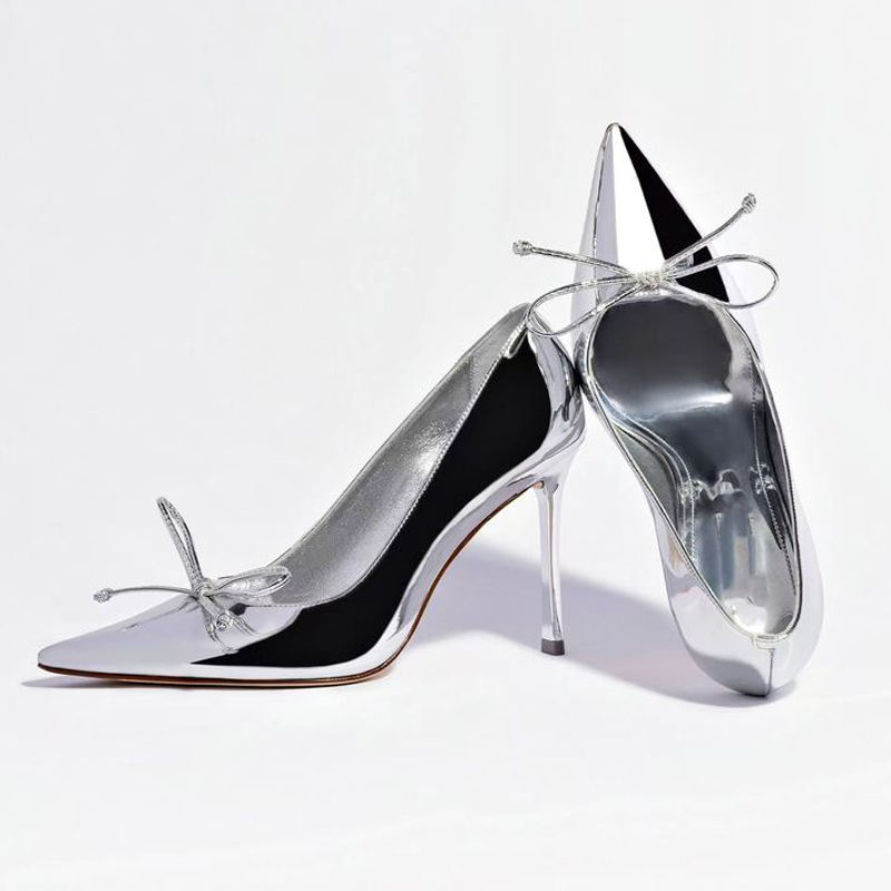 Zapatos de tacón alto y fino plateados de charol con punta, talla grande 46 para mujer, sandalias de vestir con lazo frontal para pies anchos