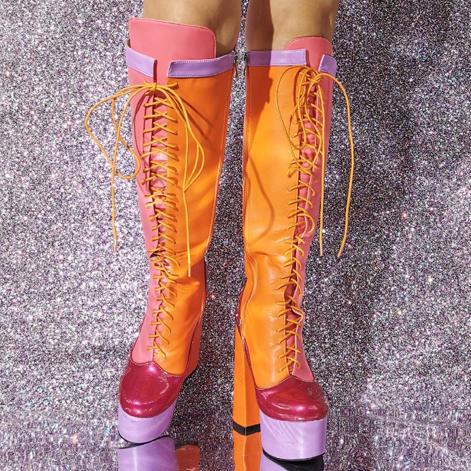 Botas de Plataforma Largas hasta la Rodilla para Mujer, Talla Grande 47, Suela Gruesa, Diseño de Parches, Colores Mixtos, con Cordones y Tacón Grueso