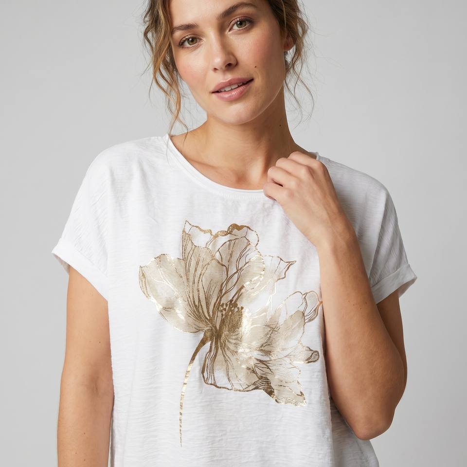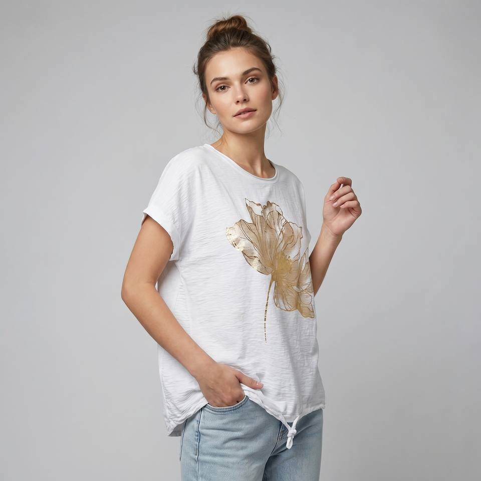 Camiseta Grande con Cordón Ajustable y Estampado Floral con Detalles Dorados, 50% Algodón, Talla Única (Tallas 38–46)