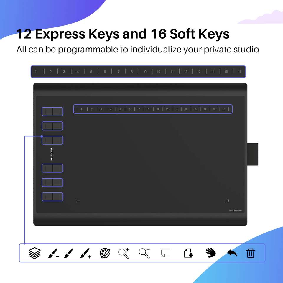 Teclas personalizables para una mayor productividad: El Huion H1060P viene con 12 teclas de prensa personalizables y 16 teclas de función personalizables, lo que permite a los usuarios crear accesos directos y flujos de trabajo adaptados a sus necesidades específicas, lo que aumenta la productividad y la eficiencia.