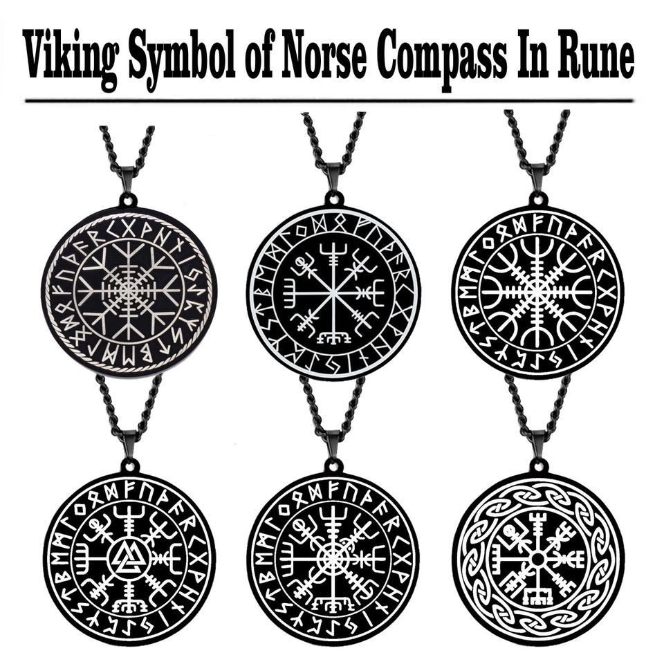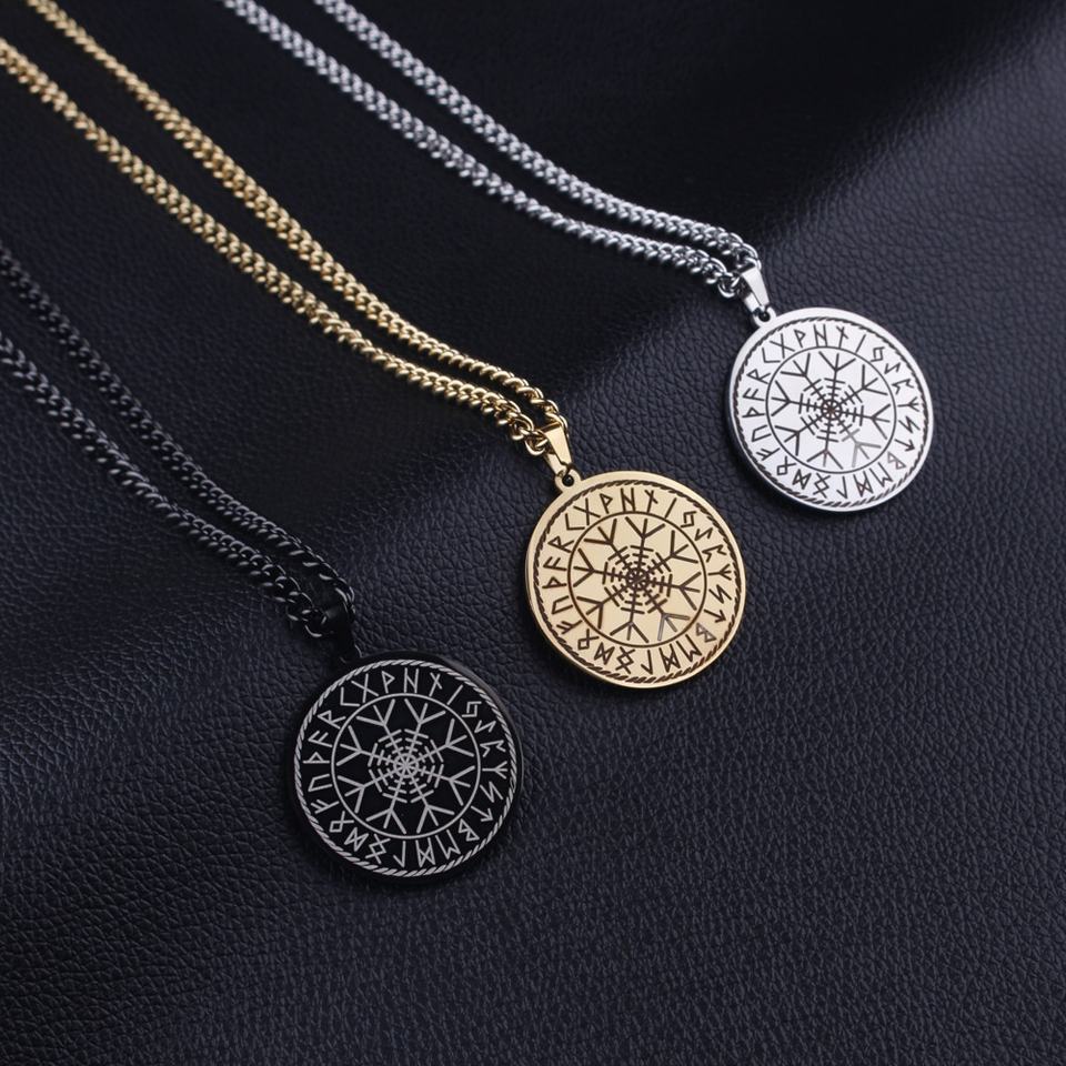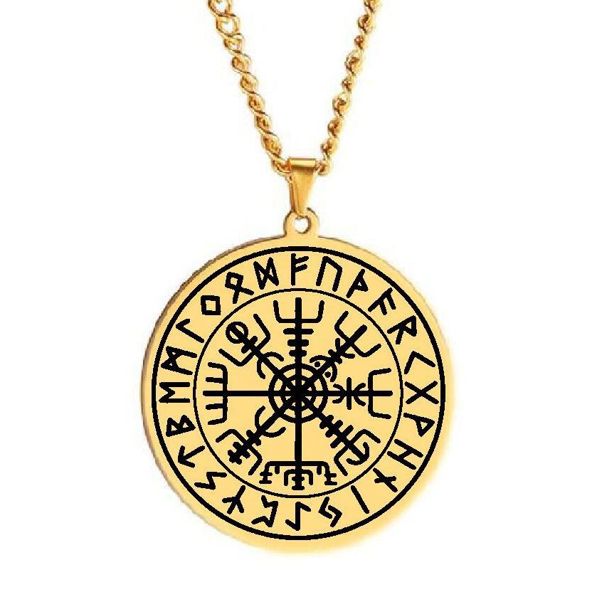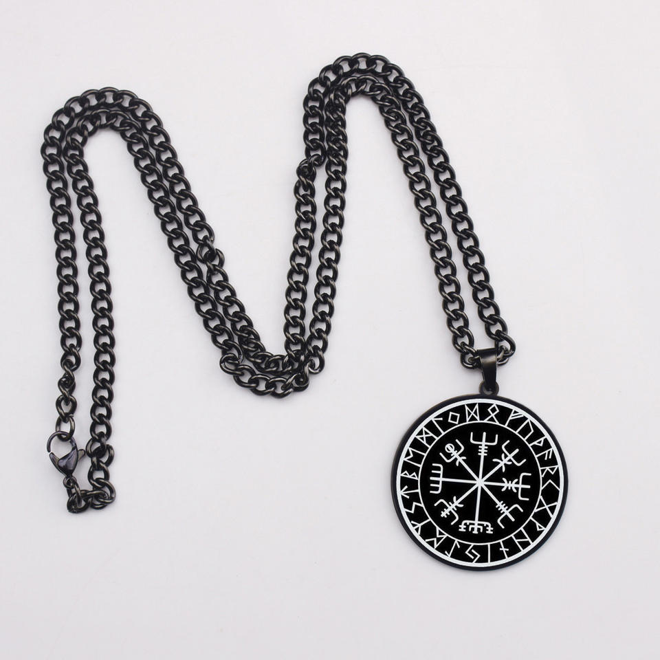 Collar con Colgante de Acero Inoxidable Color Negro y Dorado con Runas Vikingas de Protección, Brújula Vegvisir, Talismán, Grabado Láser