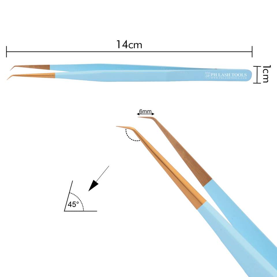 Pinzas de pestañas de etiqueta privada Slim Str, 6mm, 45deg con punta, Color dorado y azul, marca privada, pinzas de pestañas hechas a medida