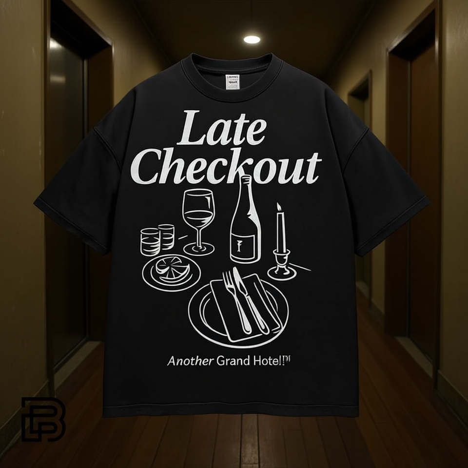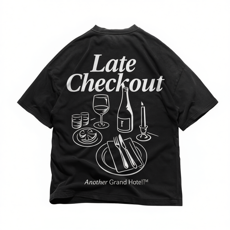 Camiseta gráfica de corte holgado en negro lavado con diseño vintage de hotel, estilo streetwear minimalista para hombre y mujer.