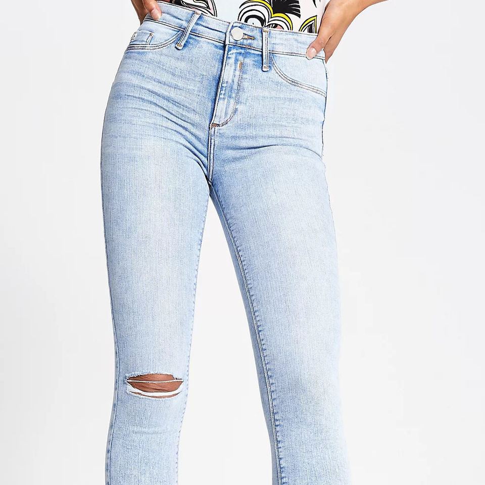 Últimos Jeans de Mujer Tallas Grandes de Tiro Medio 2026 Transpirables con Logo Personalizado al por Mayor, Jeans Biker Rotos Ajustados para Mujer OEM