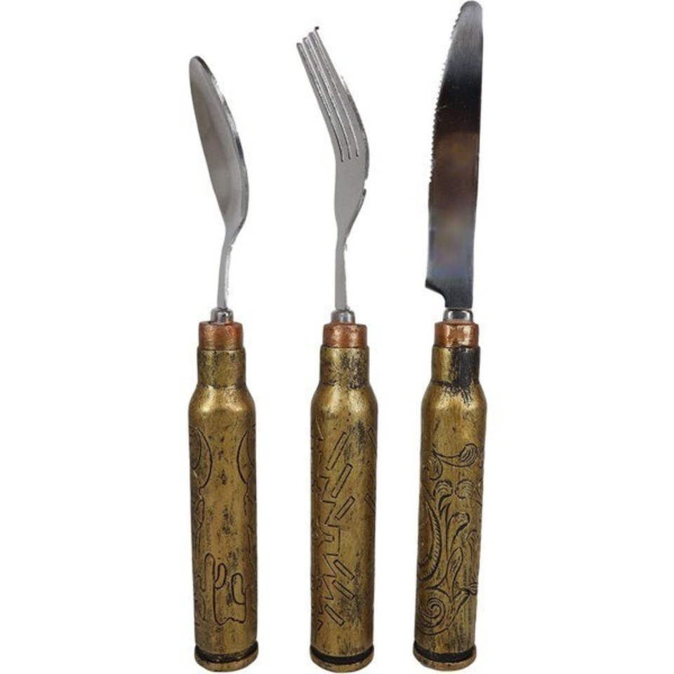 Juego de cubiertos de 5 piezas de acero inoxidable plateado de último diseño americano con asas de hojas huecas de latón dorado, vajilla hecha a mano