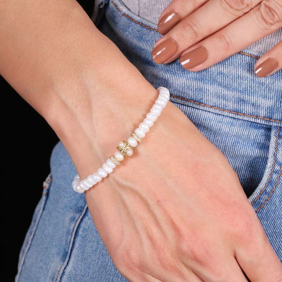 Nuevo Brazalete de Joyería Fina con Baño de Oro, Dije con Perla Natural y Cuentas de Circonita