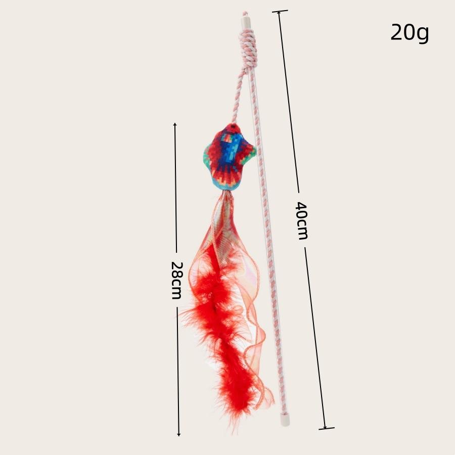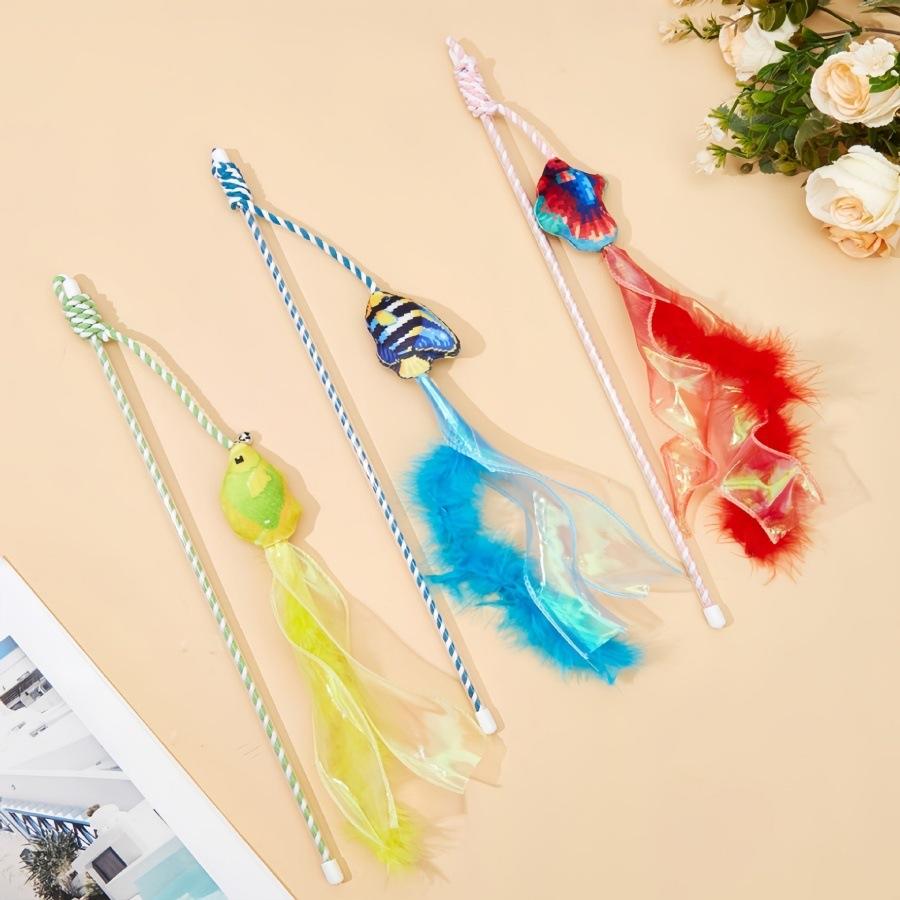 Último diseño colorido pez gato teaser varita palo golosinas interactivo gato juguete con pluma campana cinta algodón cuerda gato peluche juguete