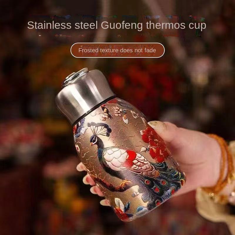 Último diseño elegante patrón de pavo real frasco de vacío botella térmica de acero inoxidable para la hidratación diaria