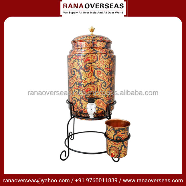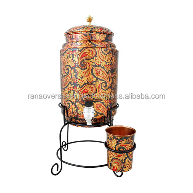 Dispensador de agua de cobre impreso de último diseño Olla de agua de cobre puro de alta venta con vidrio y uso de soporte para exteriores e interiores