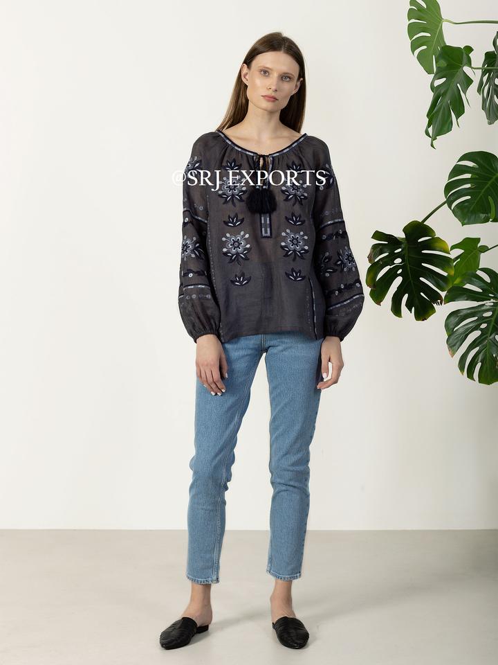 Blusa de lino con bordado geométrico para mujer, camisa de lino puro estilo bohemio con bordado geométrico de flores inspiradas en colores vivos para mujer