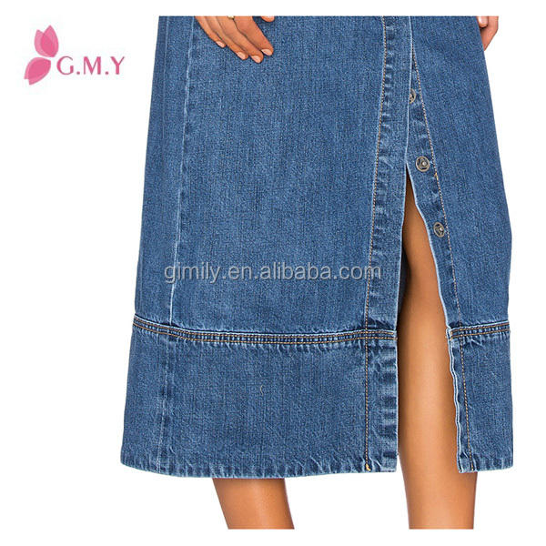 El último diseño de faldas denim faldas cintura elástico apertura tenedor abierto dobladillo OEM venta al por mayor de jeans
