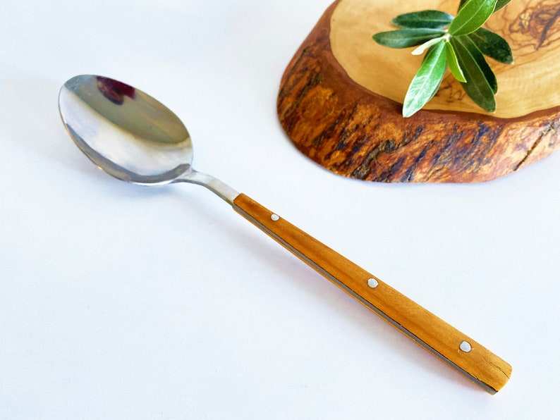 Bambú de acero inoxidable de último diseño con mango de madera Cubiertos Cuchara y tenedor Cubiertos de metal con espejo con alta calidad 2025