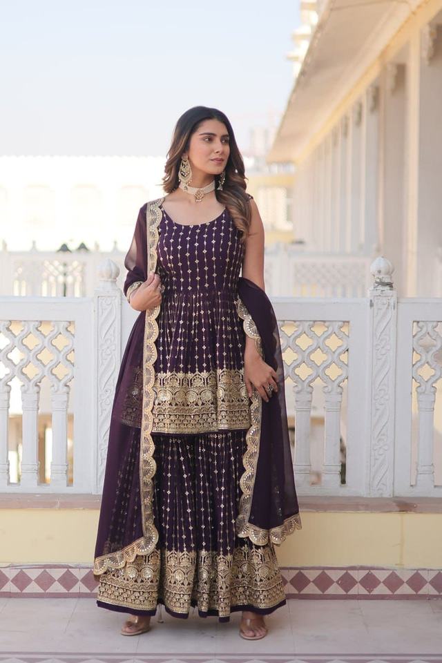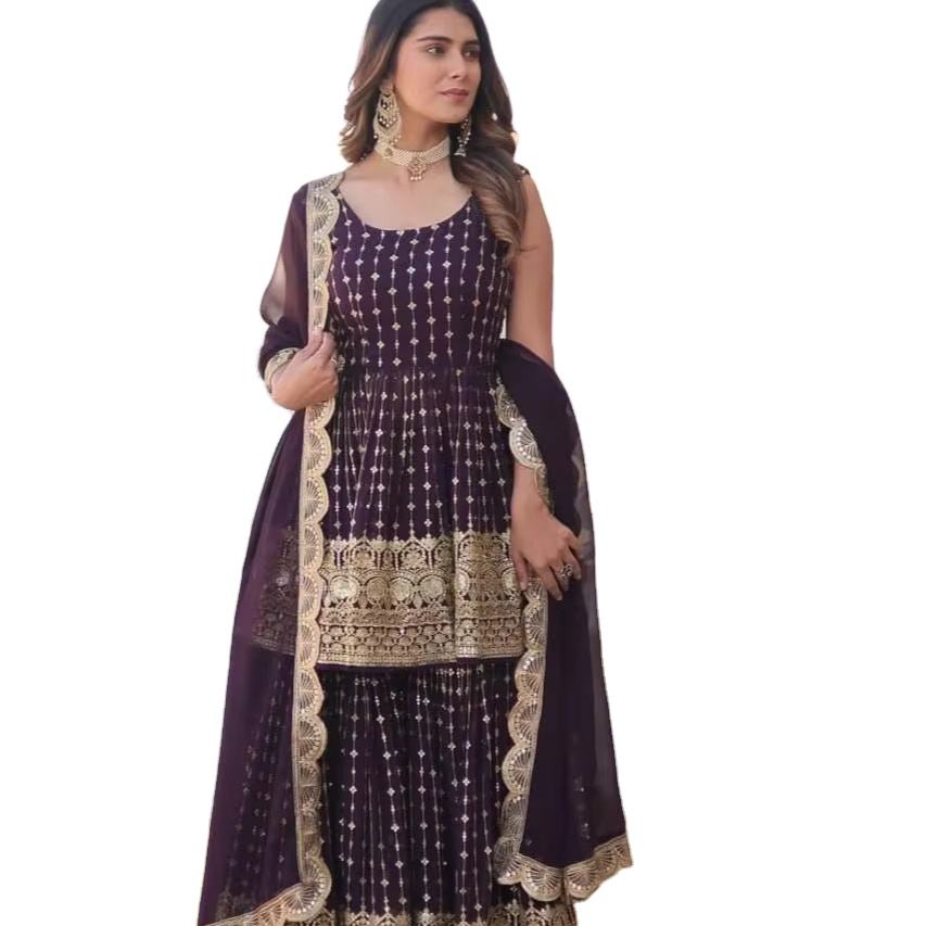 Último diseñador Fab Zone Faux Georgette bordado secuencia trabajo Sharara traje alto indio pakistaní étnico indio Sari fiestas