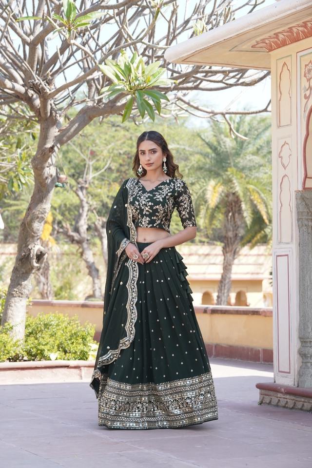 El último diseñador Faux Georgette bordado Multi Sequence Work Lehenga Choli por Fab Zone