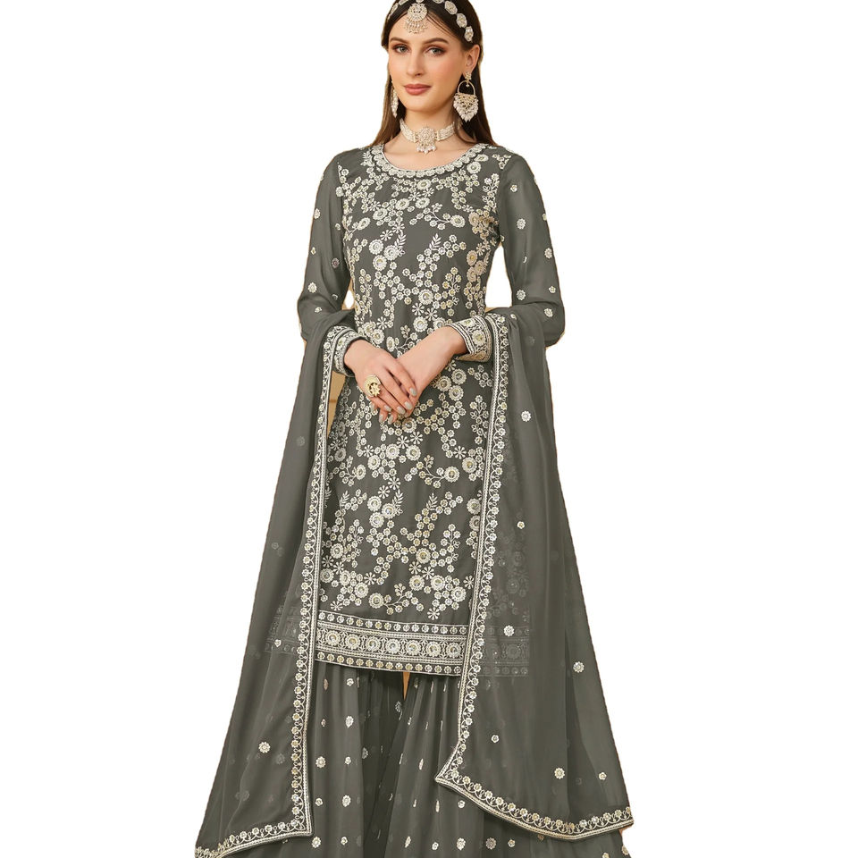 Último diseñador Faux Georgette bordado secuencia trabajo Sharara traje por Fab Zone