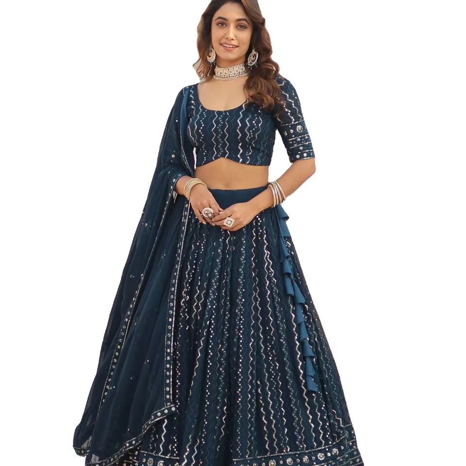 Último diseñador Faux Georgette bordado secuencia trabajo Lehenga Choli por Fab Zone