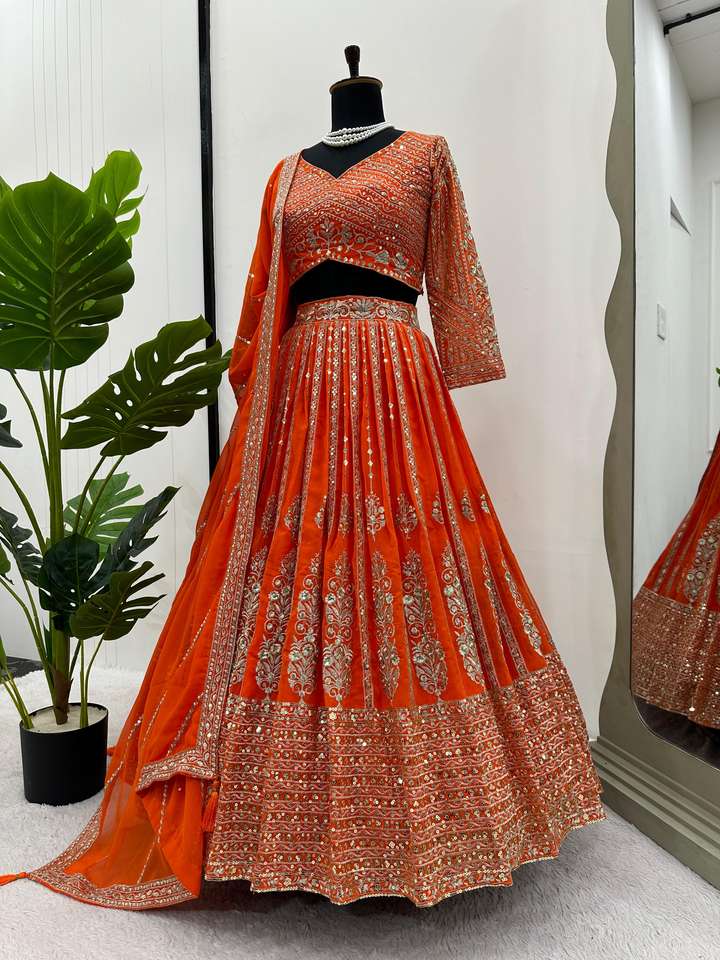 Último diseñador Faux Georgette Thread Sequence Work Lehenga Choli por Fab Zone