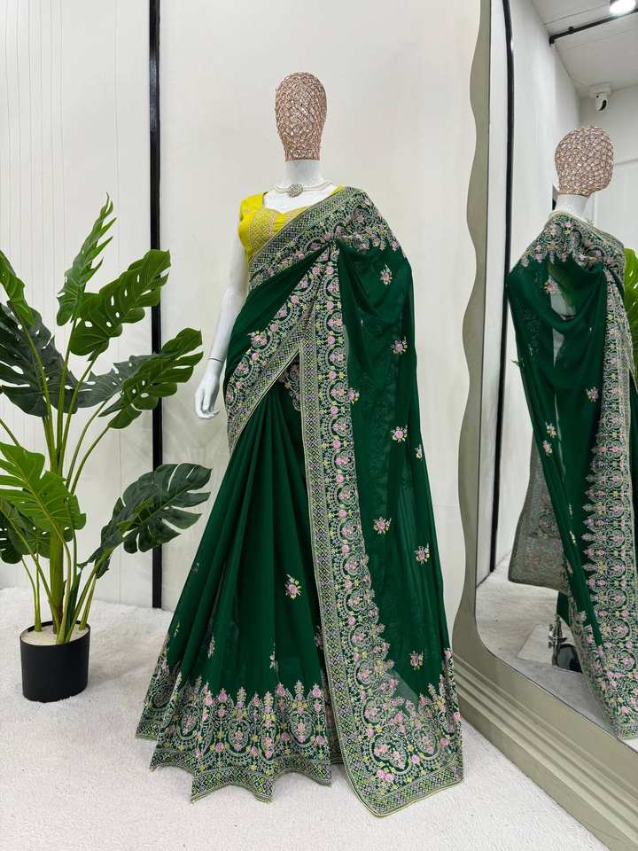 El último diseñador Faux Georgette Thread Work Saree de FabZone