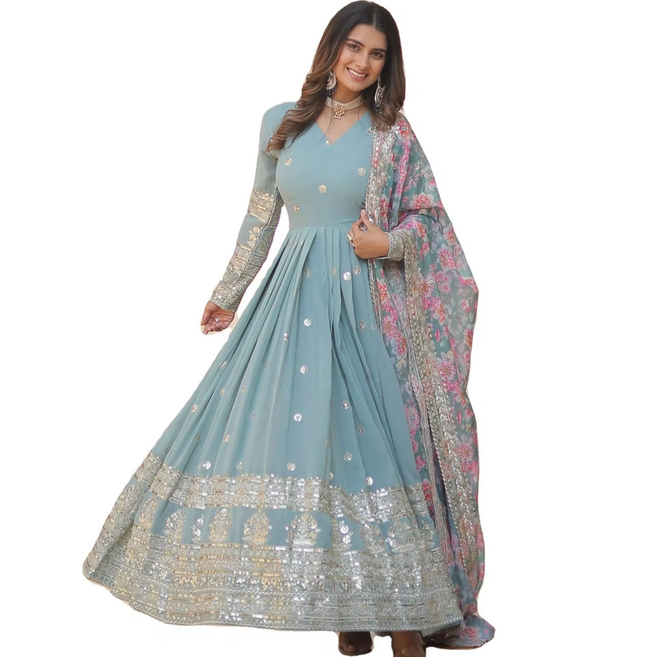 Último diseñador Faux Georgette con bordado Zari Lentejuelas vestido de trabajo por Fab Zone