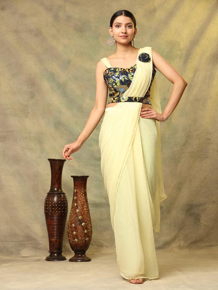 El último diseñador Georgette Silk Printed Sequence Work Listo para usar Saree de Fab Zone