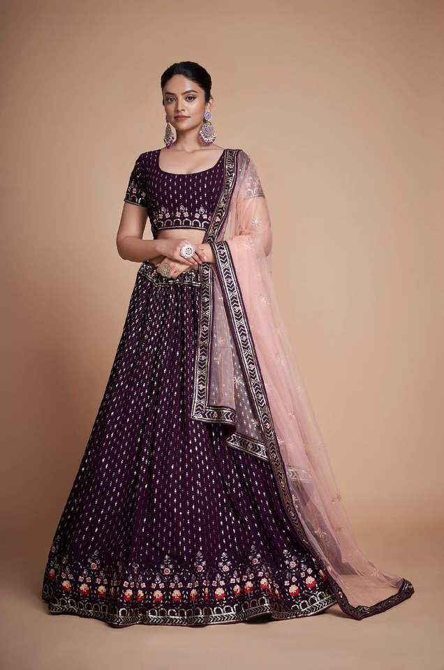 Último diseñador Heavy Faux Georgette Bordado Secuencia Trabajo Lehenga Choli Por Fab Zone