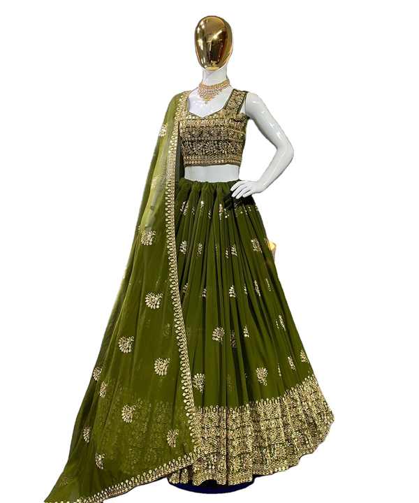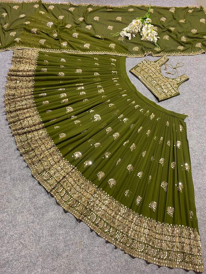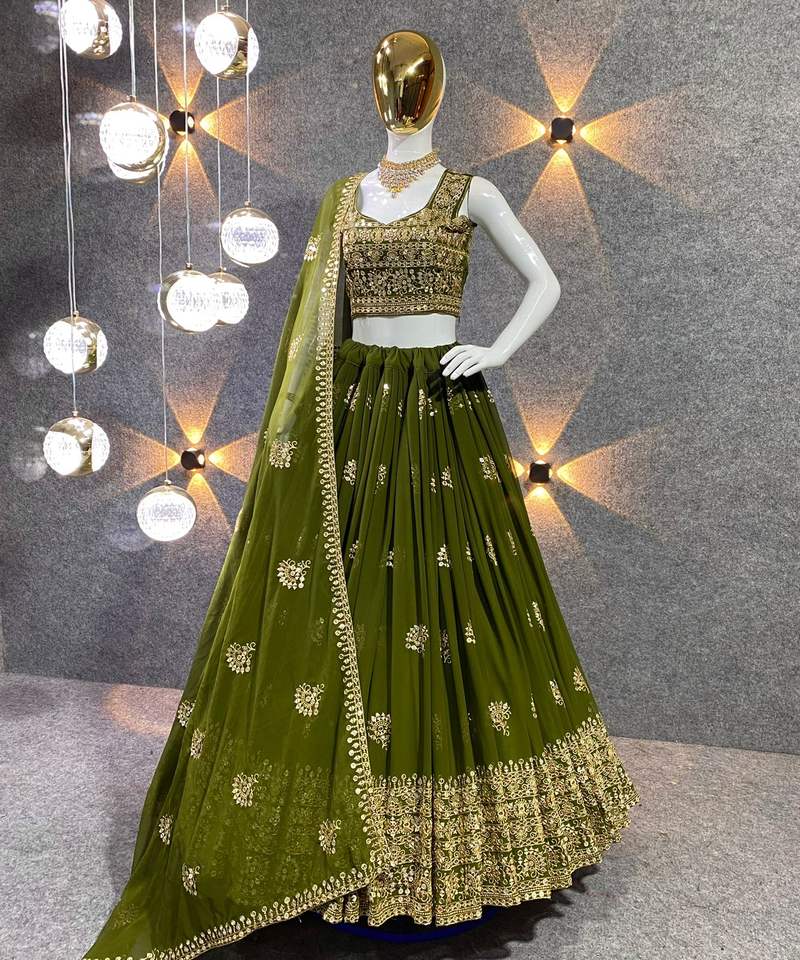 Último Diseño de Lehenga Choli de Georgette con Bordado y Lentejuelas en Color Mehndi de Fab Zone, Ropa India y Pakistaní