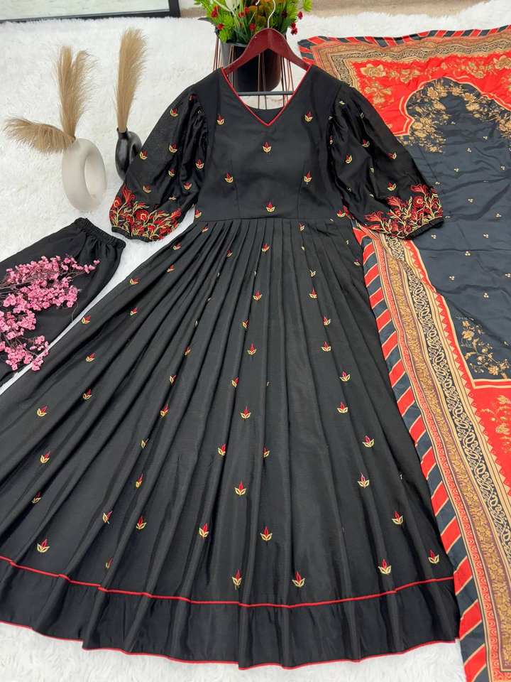 El último vestido Anarkali DE TRABAJO bordado de seda pura Chinon de diseñador por Fab Zone
