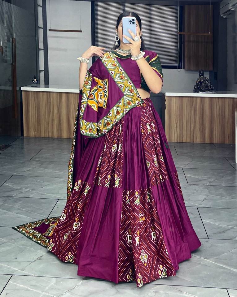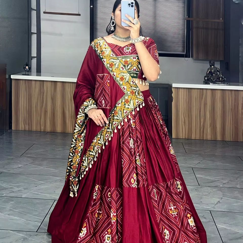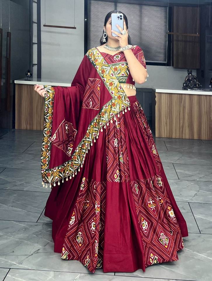Último diseñador puro rayón algodón Badhani impreso Kodi trabajo Lehenga Choli por FabZone