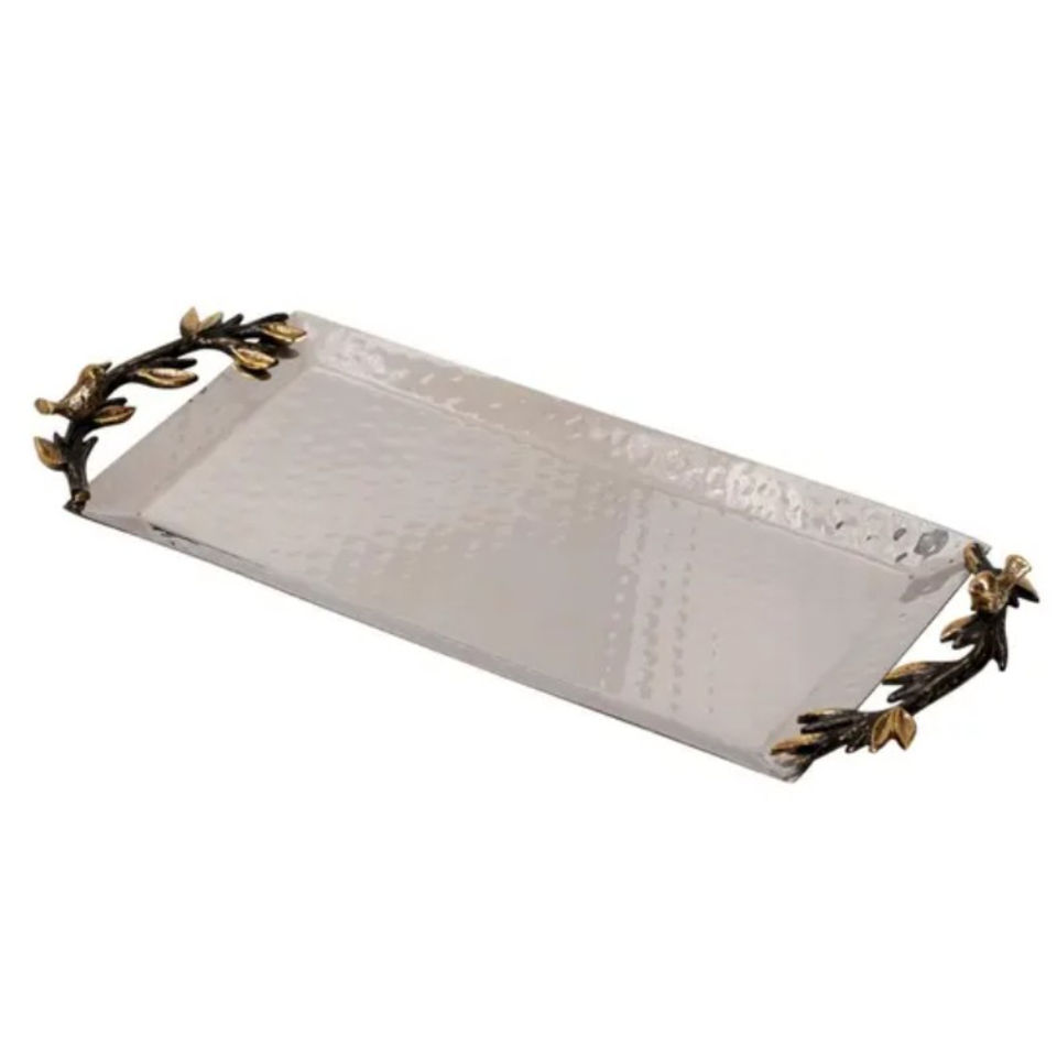 Bandeja de Servicio Rectangular Dorada de Diseño Moderno con Asas de Hoja, Diseño Martillado, Bandeja de Servicio de Metal, Bandeja Decorativa para el Hogar